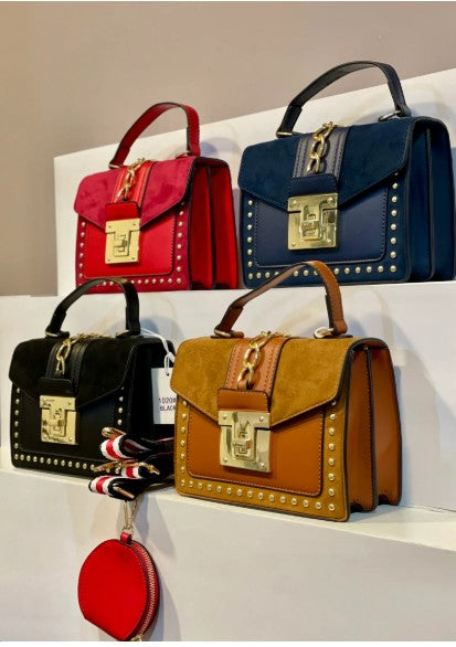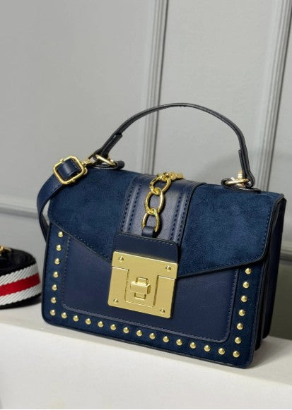Elaborado en PU (Cuero vegano, alta calidad) textura mixta (cuero-velvet), taches dorados en el borde, cadena en la solapa color dorado, herraje llamativo y estructurado, broche de lujo en centro que aportarán a tus estilo un aire vintage y llamativo.