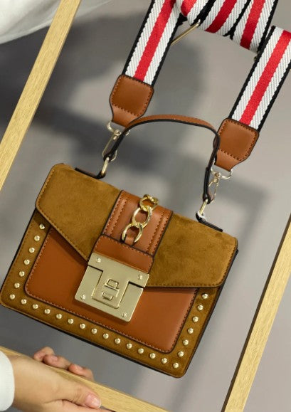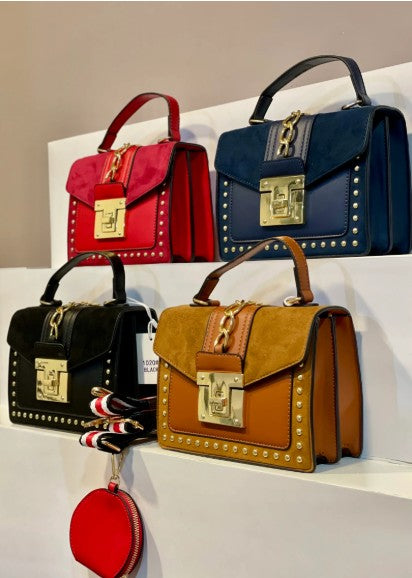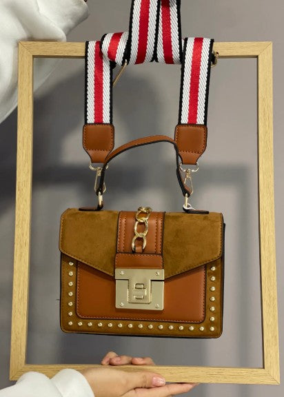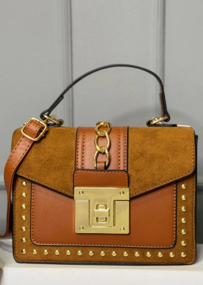 Elaborado en PU (Cuero vegano, alta calidad) textura mixta (cuero-velvet), taches dorados en el borde, cadena en la solapa color dorado, herraje llamativo y estructurado, broche de lujo en centro que aportarán a tus estilo un aire vintage y llamativo.