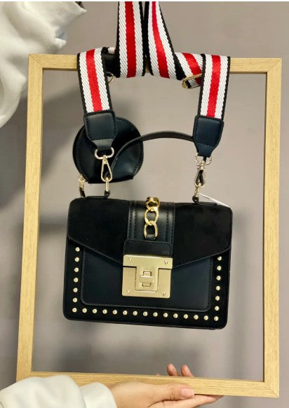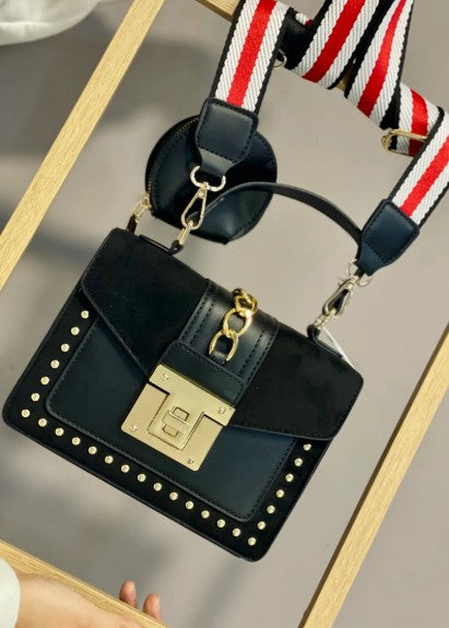 Elaborado en PU (Cuero vegano, alta calidad) textura mixta (cuero-velvet), taches dorados en el borde, cadena en la solapa color dorado, herraje llamativo y estructurado, broche de lujo en centro que aportarán a tus estilo un aire vintage y llamativo.